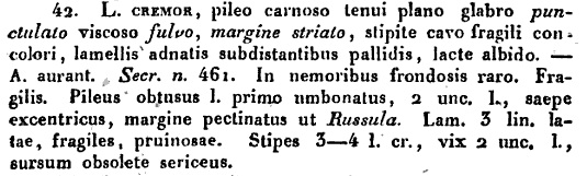 Hallo Jesko, entschuldige die "flapsige" Ausdrucksweise. In der Tat kann das zu falschen Vorstellungen führen, was die Gültigkeit eines Namens betrifft. Was den Namen Lactarius cremor betrifft, so sehe ich in der Originalbeschreibung von Fries (siehe unten) Abweichungen zu der Art, die wir unter L. cremor kennen und auch in diesem Thread gezeigt wird ("pileo [...] viscoso fulvo, margine striato", "margine pectinatus ut Russula"). Deshalb ist der Name L. cremor auf die moderne Interpretation der Art m.E. nicht anwendbar. Schöne Grüße