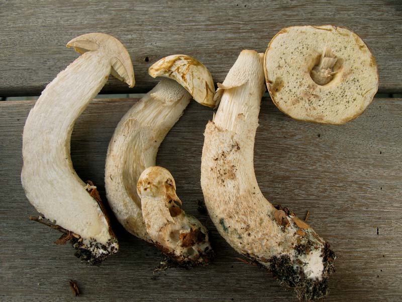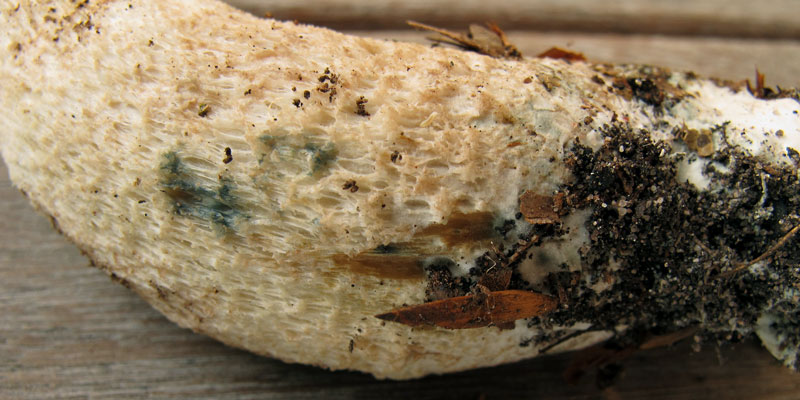 im Stiel sehr fest und weiß, an der Spitze wie Hut verfärbend, in der Basis erst nach mehreren Stunden blaugrüne Flecken zeigend, die dann erst grau werden und nach gut einem Tag ganz verschwinden.