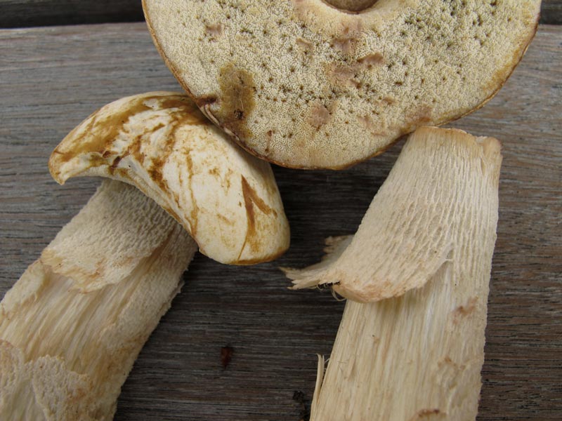 Röhren weiß-creme, mit dunkleren Vertiefungen (Maden?); Poren weiß, bei Berührung rotbräunlich verfärbend.