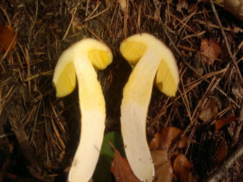 Und ein Schnitt durch die Mitte. Keine Verfärbungen im Fleisch. Kein Netz außen zu sehen. Älter Fruchtkörper mit roten Punkten am Stiel.