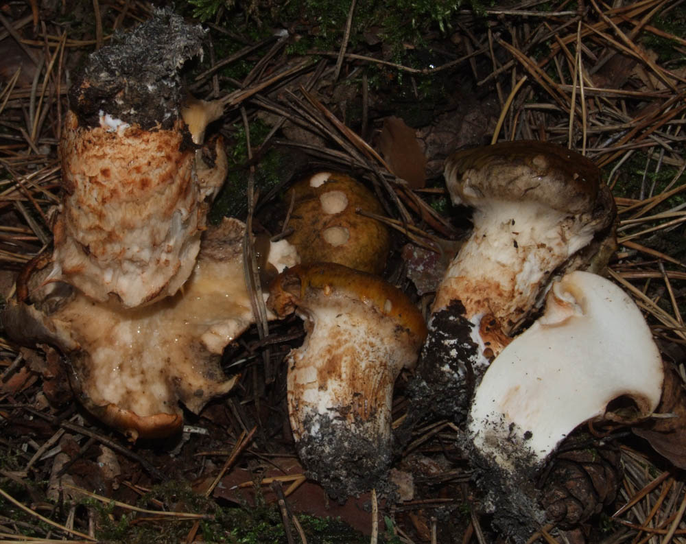 Da wird der Ingo vor Neid aber platzen, schoss es mir heute durch den Kopf, als ich zwischen Kiefernnadeln oliv und orange leuchtende Bällchen entdeckte. Da waren sie, meine ersten Orangebraunen Halsbandritterlinge (Tricholoma focale) heuer. Der Braunkohle sei Dank! Und in der Sandkiste der Republik wird's wohl noch ein paar Tage brauchen, bis es auch da ordentlich nach Mehl riecht...