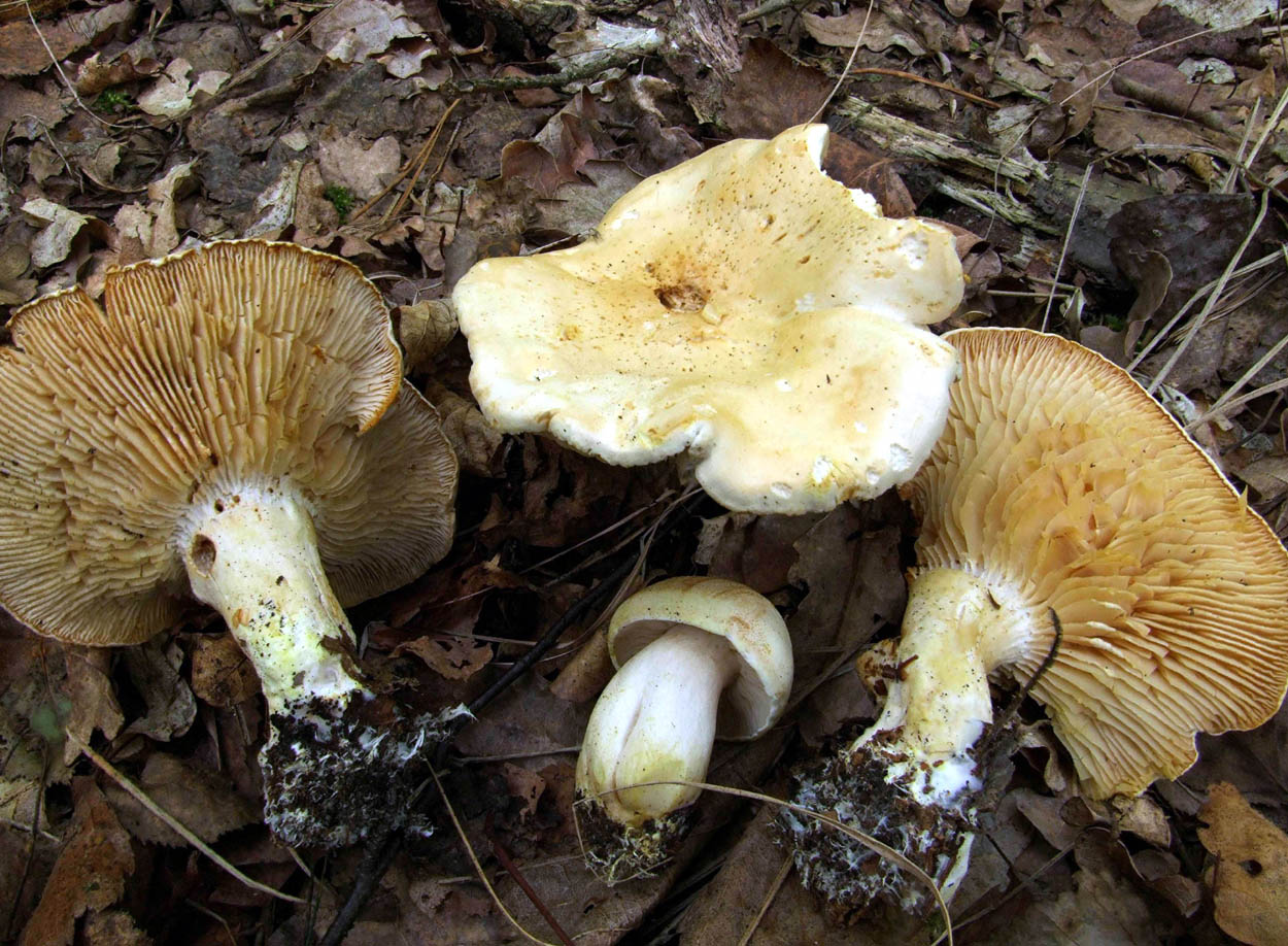 ... zumindest für mich persönlich und womöglich sogar ein Erstfund für Sachsen beschloss heute meine ansonsten kaum zufriedenstellende Vormittagsexkursion: Was sind die weißlichen Dinger da in der Jungeichenplantage mit ein paar Birken drin. Aha, Tricholoma album oder stiparophyllum wohl. Noch nie in einem Tagebaurekultivierungsgebiet gesehen! Ein bisschen komisch sehen sie aber aus für album, und mit dem Geruch bin ich auch nicht zufrieden. Doch halt, was sollen diese schwefelgelben Flecken überall, die mir wie mit dem sprichwörtlichen Zaunpfahl winkend etwas sagen wollen ... NA KLAR, TRICHOLOMA SULPHURESCENS! Den kannte ich bislang nur von zwei Sichtungen vom basischsten Muschelkalk. Nun hat er sich ins saure Sachsen verirrt. Die Braunkohle macht's möglich.