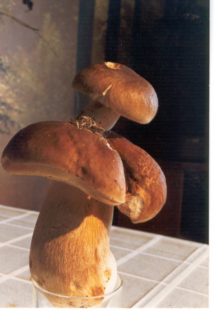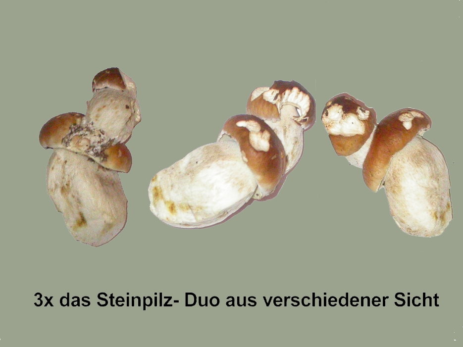 Ein Steinpilz schiebt und der obere wächst in ihn hinein.