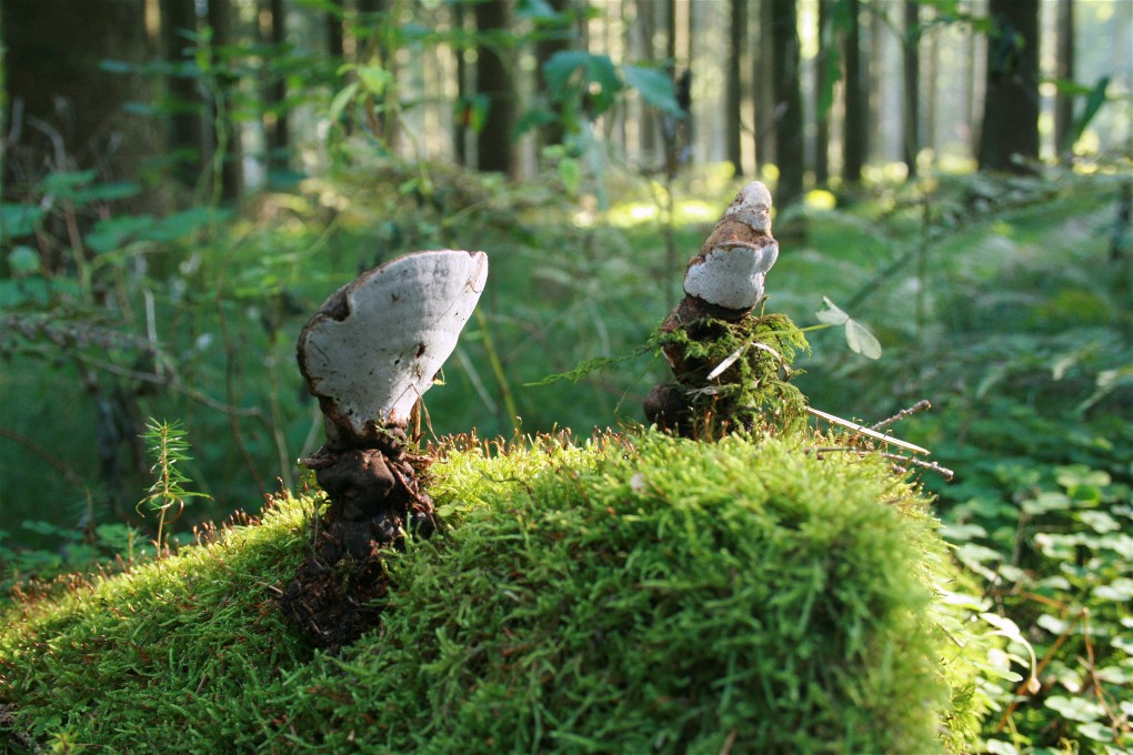 Hallo Robin, Danke für Deine Antwort!! Zum Lärchen-Porling: einjähriger FK - der ältere FK wuchs direkt am kahlen Stamm in knapp 1/2 m Höhe, der jüngere mit den vielen Tröpfchen an einer Wurzel. Der Baum war in ca. 2 m Höhe abgebrochen, die Rinde im bodennahen Bereich noch erhalten --> eindeutige Lärche, es gibt dort noch einige, sonst nur Fichte. Zum Waldzwerg: Hier noch ein ungeblitztes Foto mit beiden FK, ich hab sie zum Fotografieren auf einen Baumstumpf gestellt. Fleisch trocken - holzig, ich denke mit ziemlicher Sicherheit --> mehrjährig. Die Poren sind sehr fein (3-4 Poren/mm) und rund. Beide FK liegen auf meinen 19-Zoll-Monitor-Exsikkator. Ich denke, es sind zwei verschiedenen Arten.