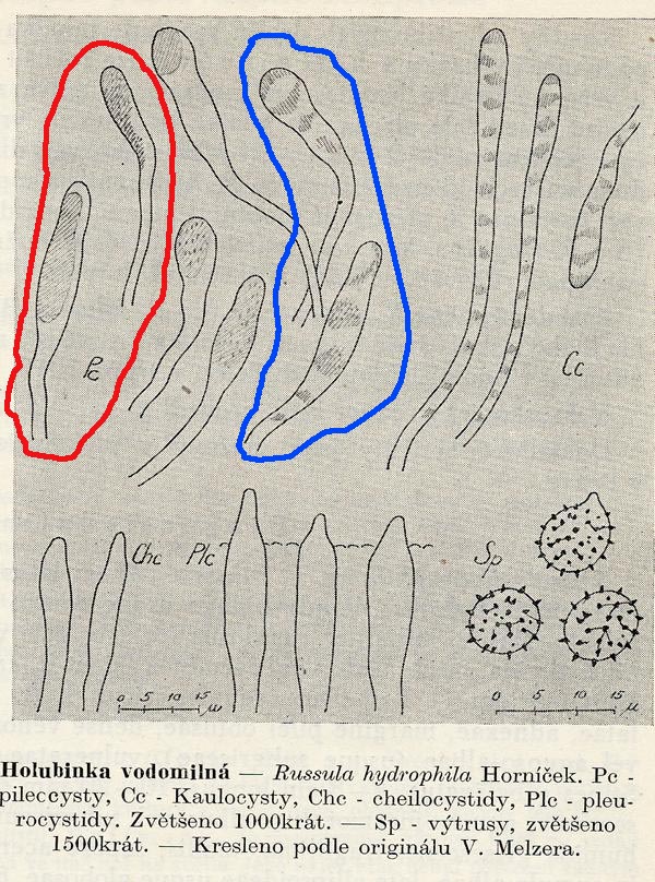 So, ich hab mir das Bild (aus Hornicek, 1958) aus dem Beitrag abgespeichert und gebs zu, dass ich zu blöd dazu bin, da nennenswerte Unterschiede zu erkennen.Ich hab das Bild mal etwas verändert und poste es hier nochmal. Links (bei mir rot eingekringelt) wäre also R. aquosa rechts (blau eingekringelt) R. grisecens. Kannst dus mir bitte nochmal genau erklären? Was bedeuten diese seltsamen Schattierungen auf den Zystiden?