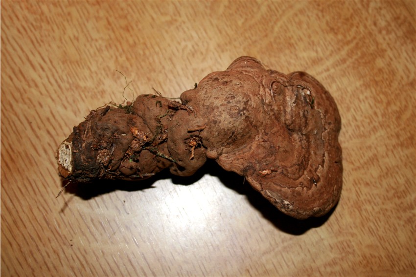 Hallo! Wieder Dank an Robin! Auf seinen Tipp hin habe ich die zwei FK nochmal in Richtung Ganoderma untersucht. Wahrscheinlich sind die Dinger steinalt und haben deshalb ihren "Lack" verloren *). Ich hab´ mich schon gewundert, dass sie bereits nach wenigen Std. auf dem Monitor-Grill so leicht waren - sie waren wohl nur aussenrum tau-nass, innen aber schon trocken. Dass bei beiden die Stiele so verwachsen sind, war eben ihr persönliches Schicksal, siehe Foto. *) Kann jemand diese Theorie bestätigen? Und was zur genaueren Art sagen? Viele Grüße - Rika