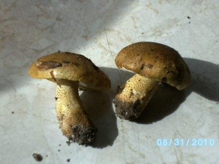Hier noch ein Bild von Tricholoma joachimii vom Hornberger Pilzkurs 2010 - damit man sich etwas unter punktiertem Stiel vorstellen kann. Laut RIVA ist der Geruch von T. joachimii mehlartig, der Geschmack bitterlich. Beides traf bei den gezeigten Exemplaren zu. T. joachimii mag es sandig. In den Nord-Kärntner Alpen (Richtung Steiermark) finde ich alljährlich an Berghängen über Urgestein Ritterlinge wie die hier beschriebenen aus dem Zillertal - mit ausgesprochen striater Hutoberfläche und genattertem, manchmal sparrig-schuppigem Stiel. Bei diesen ist der Mehlgeruch allenfalls flüchtig zu erahnen. Ich habe sie immer als T. fucatum bestimmt, auf jeden Fall sind sie etwas anderes als T. joachimii. Freundliche Grüße