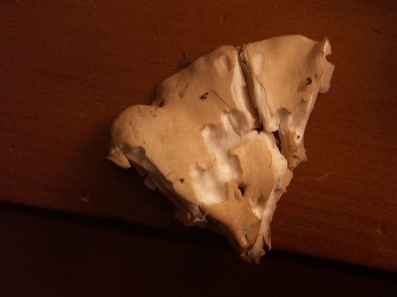 Die Farbe des Hutes habe ich vergessen. Eine Mischung zwischen Weiß, Grau, Braun und Creme-Farben. Wie blasse Haut vielleicht. Geruch konnte ich keinen feststellen. Habe einen Teil mitgenommen und fotographiert. Das Blitzlicht verdunkelt alles und zieht es ins bräunliche.