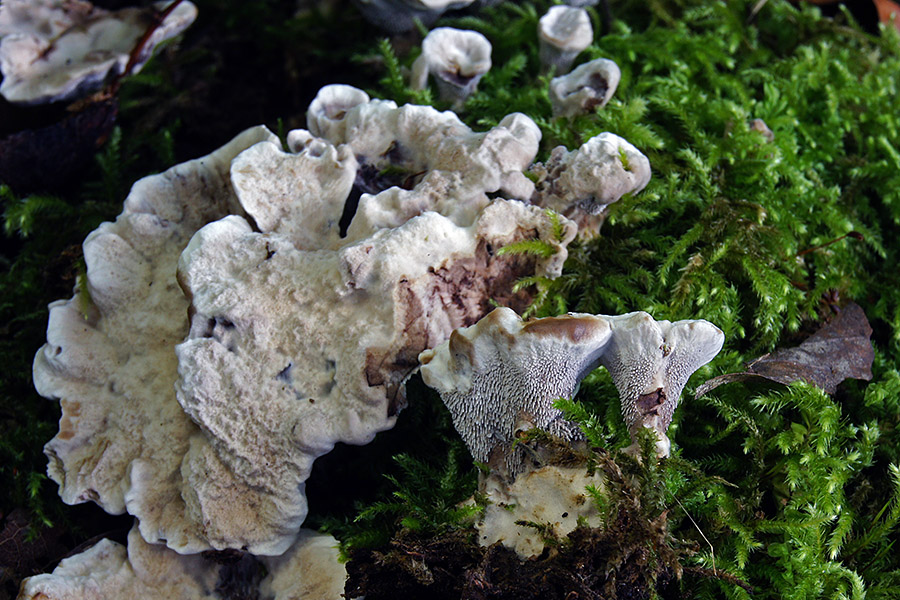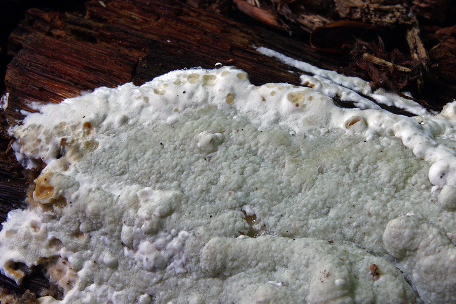 3. Den wollte ich eigentlich nochmal genauer unter die Lupe nehmen, er war zwischenzeitlich aber leider zu einem braunen Glibber vergangen. Allein die frisch grünliche Farbe, zusammen mit den Guttationstropfen in der weißen Zuwachszone, sollte doch markant sein, dachte ich. Seitlich an einem am Wegrand liegenden, dickeren, entrindeten und halb vergrabenen (wahrsch. Laubholz-)Ast, FK knapp 20 cm Ausdehnung. Als ich Zeit dafür hatte, fand ich nur wenige Sporen, die allerdings für mich wie auch der Rest zu Gallertiger Gloeoporling - Gloeoporus pannocinctus (Blassgrüner Knorpelporling - Ceriporiopsis pannocincta) passten. Gibt es da noch Ähnliche, oder kann man das so stehen lassen?