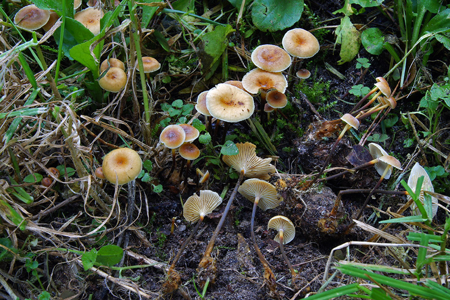 11. An diesen Teilen vom vergangenen langen Wochenende hatte ich mich vor zwei Jahren schon makroskopisch versucht, die Mikroskopie gibt für mich keine neuen Erkenntnisse. Ludwig erwähnt bei Xeromphalina "alle makr. bestimmbar". Na dann, herzlichen Dank für den sanften Wink... Ich kann mich nicht zwischen X. cornui und X. caulicinalis entscheiden, der gelbe Filz scheint ja bei beiden zu sein. Über eine evtl. Laugen-Reaktion bei cornui finde ich nichts, meine färben zumindest mit KOH sofort ordentlich (braun-)rot. Dass bei den Ausgrabungen zumeist Kiefernzapfen mit zum Vorschein kamen, ist ggf. noch erwähnenswert. Gewachsen auf einer gemähten Friedhofswiese unter Kiefern: