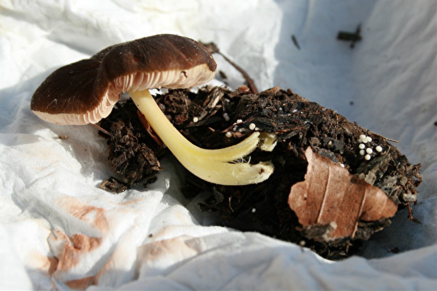 Hallo miteinander! Als ich die Schleimpilz-Mini-Eier kontrolliert habe (siehe Bild 1+3, nach denen traue ich mich ja gar nicht zu fragen...), entdeckte ich auf dem Sägespanhaufen neben einem Forstweg zwischen den Eiern zwei richtige, frische Pilze. Der verrottende Spanhaufen kann keiner Holzart zugeordnet werden, darunter sehr lehmig (Kalk). Weil ich weder Korb noch Kamera dabei hatte, packte ich das gute Stück mit etwas Substrat in ein Papiertaschentuch, daher sind auf dem Hut einige weiße Fussel. Hut dunkelbraun, Hut-DM = 3 cm; Lamellen altrosa, Sporenpulver vorne links beim 1. Bild - fleischrosa(?); Stiel hellgelb, fasrig, Stiel-DM = 0,4 cm. Ich bilde mir ein, diesen Pilz erst kürzlich hier im Forum gesehen zu haben?! In meine (wenigen) Büchern + Internet finde ich ihn nicht. Kann mir jemand einen Tipp geben? Grüße - Rika