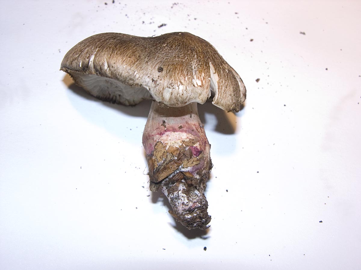 Das Rot ist nicht bräunlich, siehe das Bild unten. Dadurch, dass der Pilz noch steht liegt der Stiel im Schatten. Wichtig ist aber auch, dass keine blaugrüne Flecken an der Stielbasis sind. Tricholoma orirubens kann sowohl rote als auch blaugrüne Flecken an der Stielbasis haben. Tricholoma basirubens habe ich jedenfalls so verstanden, dass er nur rote Flecken an der Stielbasis haben soll, aber ich kann mich ja auch irren. Bei Uschis Bild sehe ich neben den pinken Flecken deutliche blaugrüne Flecken an der Stielbasis. Ich könnte mir bei Uschis Bild auch Tricholoma orirubens vorstellen. : Darüberhinaus passt mir die Hutbedeckung auch