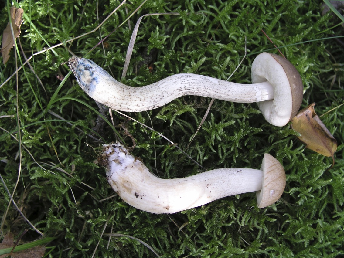 Dieser Rauhfuss wuchs ziemlich häufig in der südwestschwedischen (küstennahen) Heidelandschaft. Ich denke es könnte sich um Leccinum schistophilum, Schiefer Rauhfuss, handeln. Mikroskopiert habe ich sie nicht, Herbarbelege wären jedoch meist vorhanden. Von oben betrachtet waren sie normalen Birkenpilzen sehr ähnlich. Jedoch besassen alle eine blaugrün verfärbende Stielbasis und rötendes Fleisch. Die Pilze scheinen in ihrer Grösse und vom Standort (trockene Heide - feuchtes Ufer) her sehr variieren zu können. Hab auch mal von einem Leccinum palustre gehört, der wird jedoch in Funga Nordica mit L. schistophilum synonymisiert. Auf jeden Fall scheint die Art (falls es sie ist) ziemlich unbekannt zu sein, was mich doch sehr überrascht, da sie zumindest an der schwedischen Westküste ausgesprochen häufig erscheint.