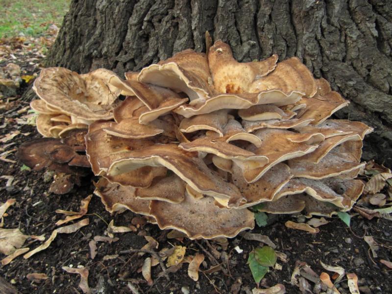 Vor Ort war der Klapperschwamm sofort mein erster Gedanke. Erst zu Hause bin ich auf den Riesen-Porling aufmerksam geworden. Das hat mich dann doch etwas aus der Bahn gebracht. Aber der Habitus mit den durchmischten Hüten spricht eher für den Klapperschwamm. Außerdem habe ich ein paar Teile zum Verzehr mitgenommen; beim Putzen schwärzten sie nicht. Den Riesen-Porling habe ich übrigens auch gefunden.