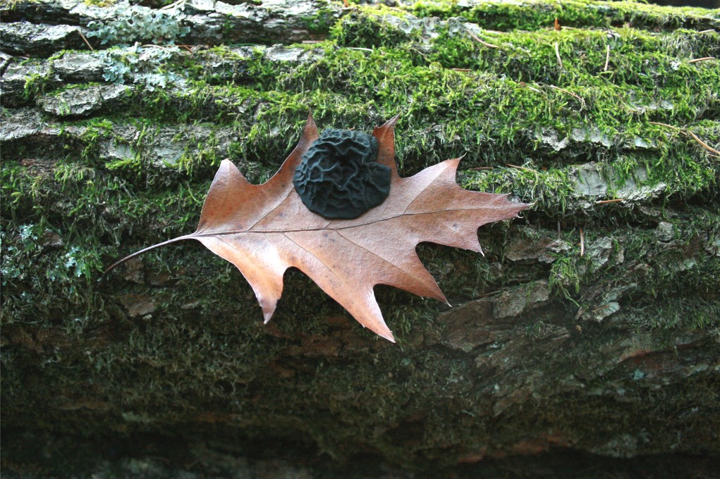 Ein schwarzer Schmutzbecherling, dem ich ein Eichenblatt untergeschoben habe...