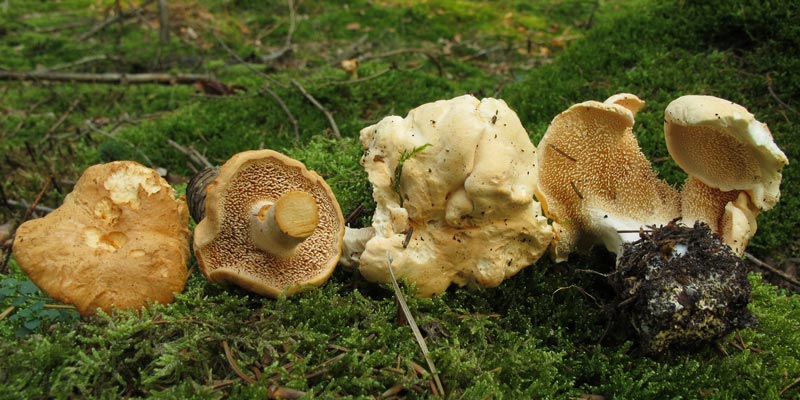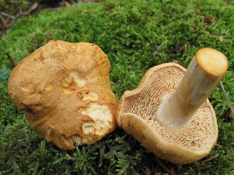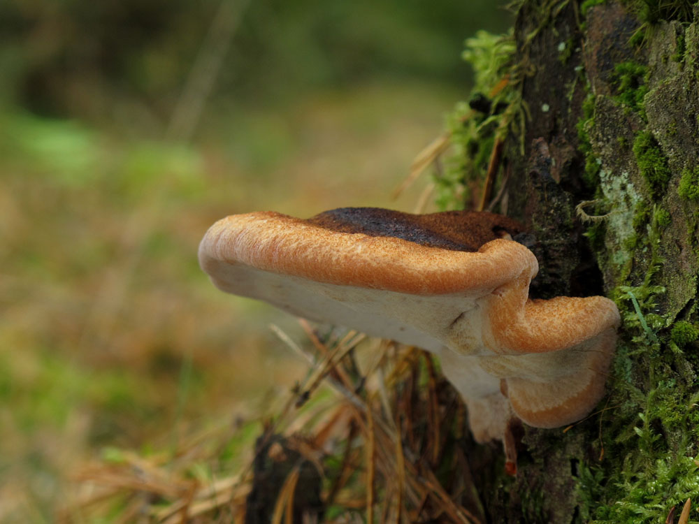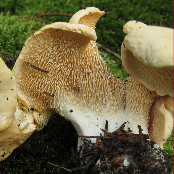 Im Fichtenhochwald mit einzelnen jungen Buchen über Bundsandstein fand ich zuerst einen großen Trupp H. rufescens. Zwei Meter daneben aber noch einen mehrfach Fruchtkörper (rechts) H. repandum.
