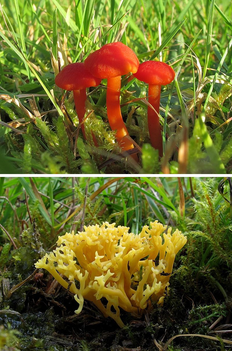 Mennigroter Saftling (Hygrocybe miniata) vom 14.10.2011 und Geweihförmige Wiesenkeule (Clavulinopsis corniculata) vom 19.10.2011. LG Ingo