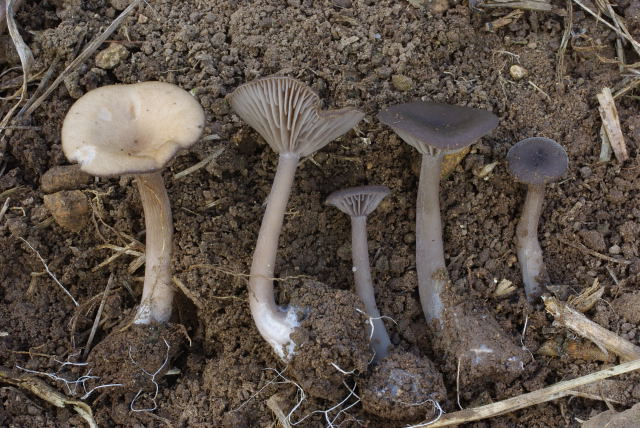 Servus Trichterlingsfreunde, mit der Gattung habe ich ja nicht viel am Hut. Wenn ich aber an einem Rand eines Rüben-Ackers eine dunkelgraue, stark hygrophane Clitocyben mit auffälligen Mycel-Rhizoiden an der Stielbasis finde, dann meine ich, die kriegst Du raus. Nix war's! Die ovalen Sporen maßen bis ca. 12 x 8 µm. Recht weit entfernt standen uralte Salix cinerea, ansonsten Brennesseln und Gebüsch (z. B. Schlehen). Weiß jemand was mit dem Ding anzufangen? Gruß Helmut