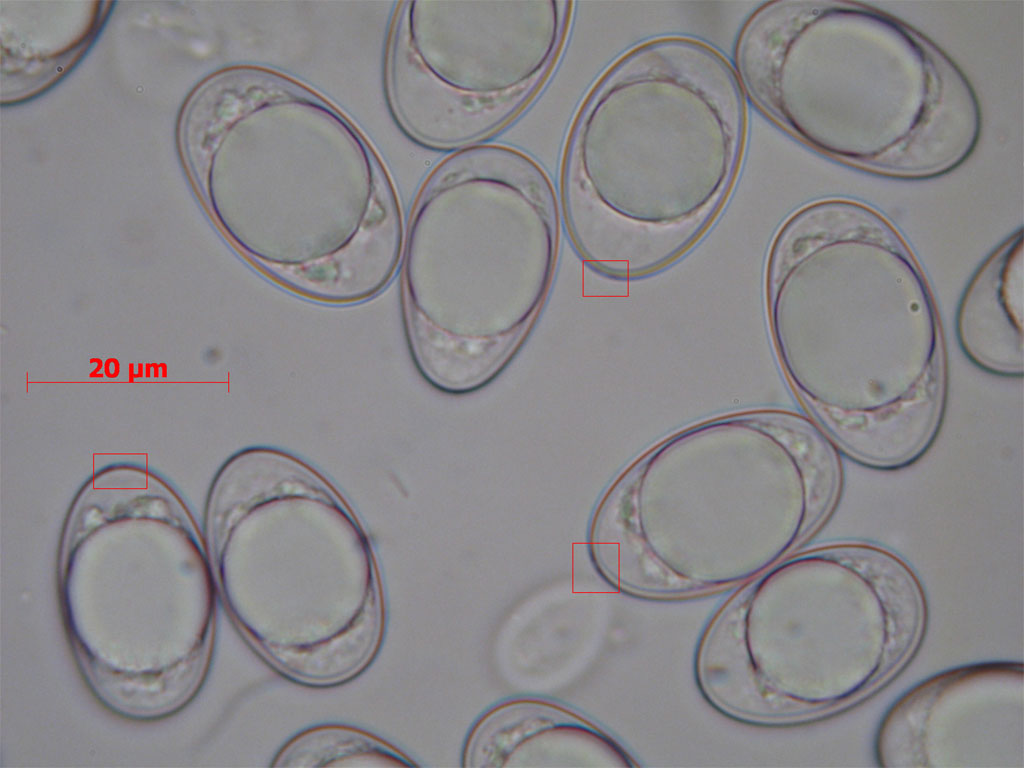 Der Schlüssel von Benkert führte direkt zu G. sepulta. Sporen [95% • 38 • SAP • v • H2O(nat) ] = 22,5 - 25,4 - 28,4 x (14,2)14,4 - 15,9 - 17,4 µm Q = 1,42 - 1,78 Es handelt sich also um eine häufigere Geoporaart. Trotzdem bin ich mal wieder überrascht, was man so alles mitten im Ruhrgebiet finden kann. Und erst die Sporengröße... Ach ja, was mir aufgefallen ist, auf den Fotos aber untergeht: Die Sporen haben an einem Ende einen kleinen hellen Punkt in der Peridie, vielleicht so etwas wie einen Keimporus.