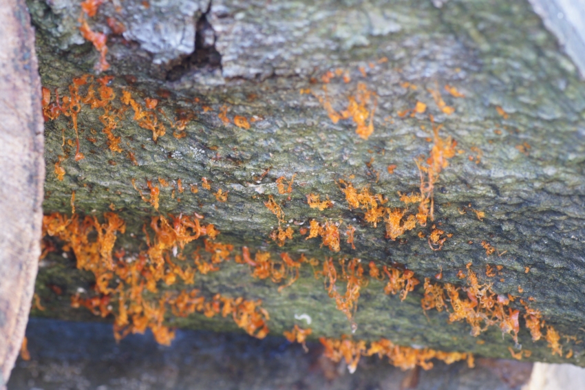 Hallo, schon öfter gesehen an geschlagenem Holz, hier an Rotbuche: ausgetretener Zellsaft, oder Hyphen, oder …? Grüße, Heiko