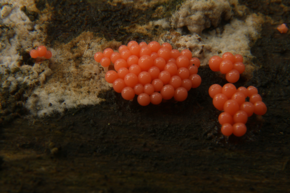 Diesen doch recht häufigen Schleimpilz fanden wir gestern auf einem vermodernden Baumrest neben Serpula himantioides, dem Wilden Hausschwamm. Die Bildbreite beträgt 20 mm. Beachtet die weißen Stielchen, auf denen die Kugeln sitzen!