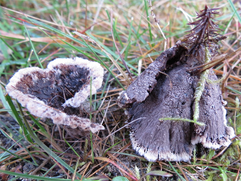 An einer etwas feuchten Stelle mehrere Dauerporlinge (Coltricia perennis) in ungewöhnlich dunkler Farbe.