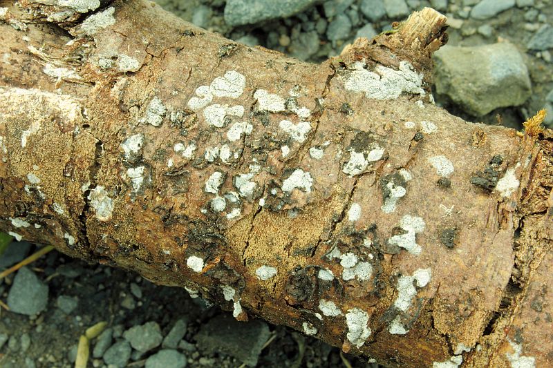 Diesen eher wie eine Flechte anmutenden Pilz hat Harald Ostrow von der Zugspitze mitgebracht - Stigmatolemma conspersum. Die winzigen Becher sind cyphelloide Basidios.