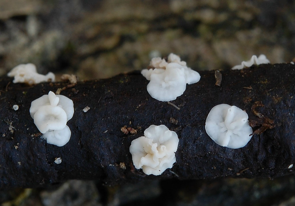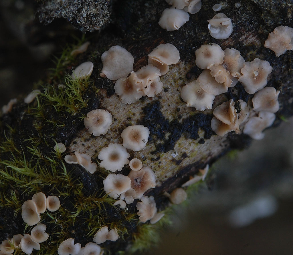 Calycina vulgaris (Fr.) Baral--- dieser helle, kurzgestielte Becherling hat etwas blumig-wellige Apothecien.