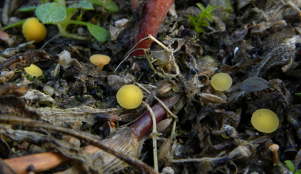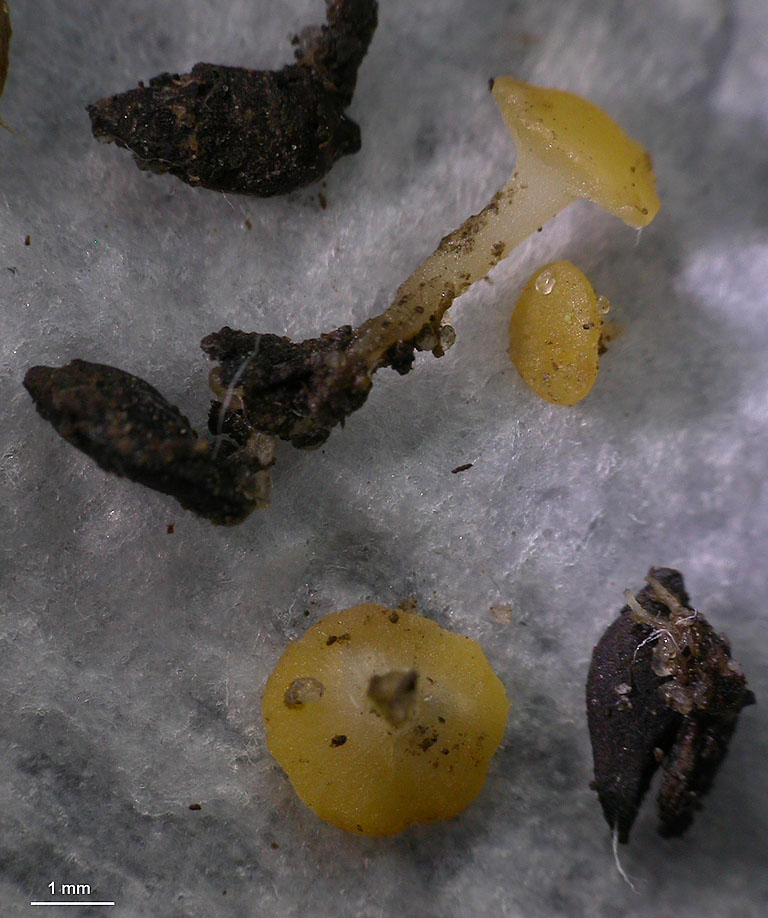 Der auffällig gelbe, gestielte Apothecien bildende Ascomycet entspringt einem in der Erde verborgenen Samen