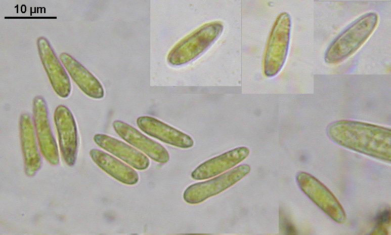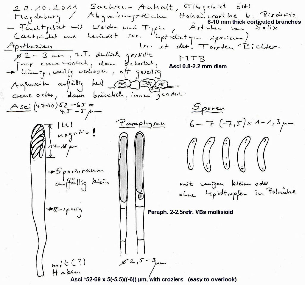 Er wuchs gesellig, gedrängt an feuchtliegenden, bzw. noch anhängenden Salix-Ästchen. Die Sporen sind