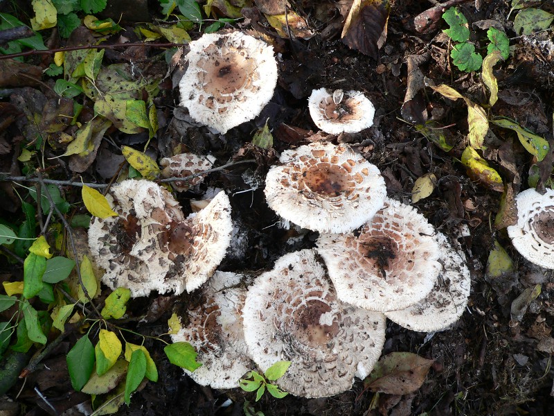 Ein Haufen mit Grünabfällen, der bisher nichts nennenswertes an Pilzen gebracht hat, scheint nun gerade zu explodieren vor lauter Riesenschirmlingen. Die gezeigten Pilzhüte waren auch mit Laub bedeckt, nur der am rechten Rand mit dem dunkleren Hut nicht. Wenn ich die Diskussion vom 3. Oktober richtig verstanden habe, sollte das nun Chl. brunneum sein. Was meinen die Experten? Gruß Alis