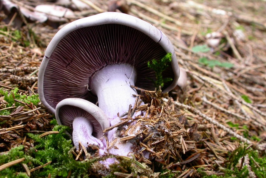 Lilafarbener Rötelritterling wächst in kleinen Trupps.