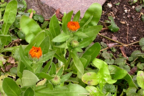 Ringelblumensamen haben sich zum Wachstum entschlossen. Dabei blühen und knospen deren Eltern noch.