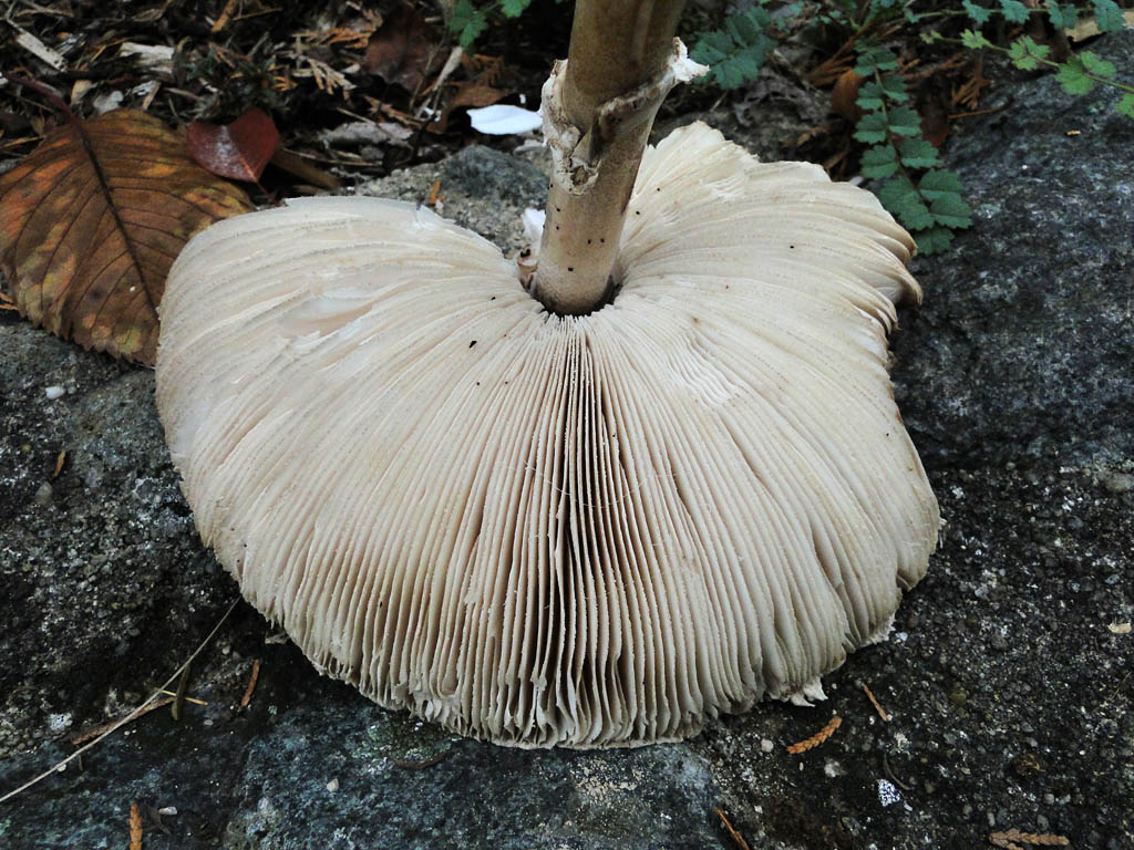 Beim Schnitt durch Trama und Lamellen kann man erkennen, dass bei M. procera kein wirklicher Farbunterschied zwischen Lamellen und Hutfleisch besteht,