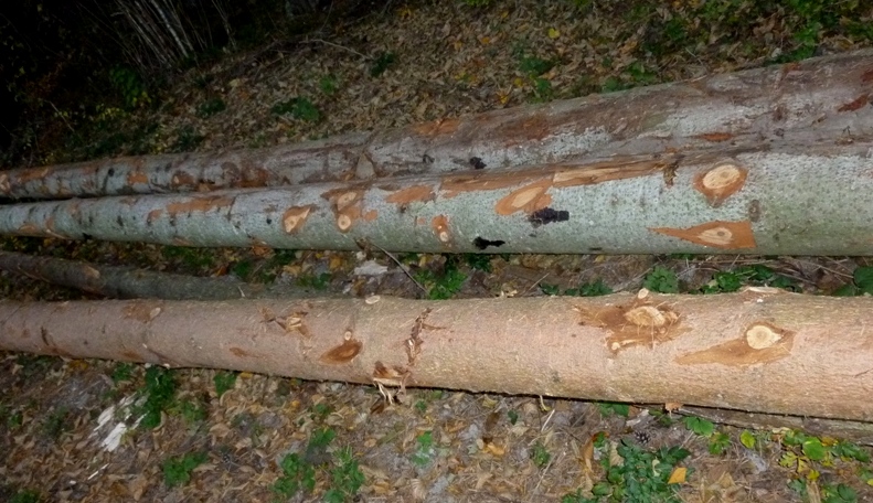 Stämme von (Weiss)Tannen (abies) und Fichten, Rottannen, (picea) gerade gestern aufgenommen oben in unserem Gemeindewald, der oft voll ist von Lactarius deterrimus (Fichtenreizker meistens mit Grünanteil) und Lactarius salmonicolors (Lachsr. ohne grüne Farben und in der Regel mit Gruben im Stiel; bei abies auftretend)