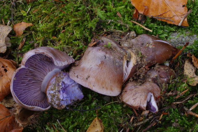 Liebe Schleierlingsfreunde, habe mich mal wieder einiger Phlegmacien angenommen. Da ich mich mit denen noch nicht so intensiv auseinandergesetzt habe und auch nicht über die aktuellste Literatur verfüge (Funga Nordica ist ausverkauft!), möchte ich die Funde und Ergebnisse auf diesem Wege zur Diskussion stellen. Geschlüsselt wurde mit Gminder (2010) und Moser (1983, 1960). Diesmal geht es um eine Art, die am Hut düster braun-graubläulich und eingewachsen faserig ist, blauviolette Lamellen, Stiel und Trama hat und deren Trama und Stieloberfläche auf Druck deutlich violett fleckt. Mit den Schlüsseln von Gminder und Moser landet man bei den Scauri. Da ich nicht über Lugol verfüge, habe ich ersatzweise Melzers aufgebracht – und siehe da, die Trama verfärbte sich rötlich (im direkten Vergleich mit einer anderen, noch nicht bestimmten Art, die gelbockerlich färbte). Der Geruch war etwas würzig, eher angenehm, die Sporen zeigten sich nur sehr schwach warzig und etwa 8-9,5 (10) x 5-5,5 µm groß. Die Bestimmung lief auf C. occidentalis hinaus, aber die dort beschriebene Ähnlichkeit mit C. caeruleus konnte ich nicht nachvollziehen. Zudem scheint die Art äußerst selten zu sein. Gruß Helmut