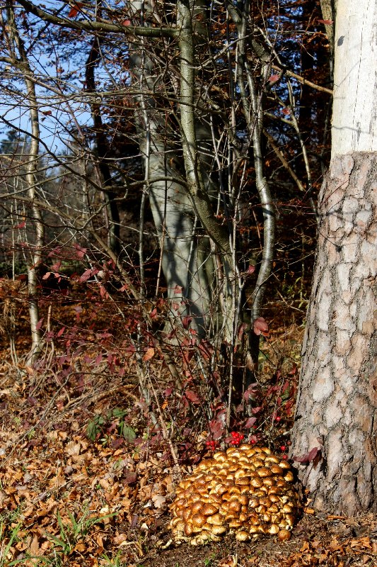 : Die Kiefer, an dem unser Pilz wächst, steht gleich neben vielen Buchen.
