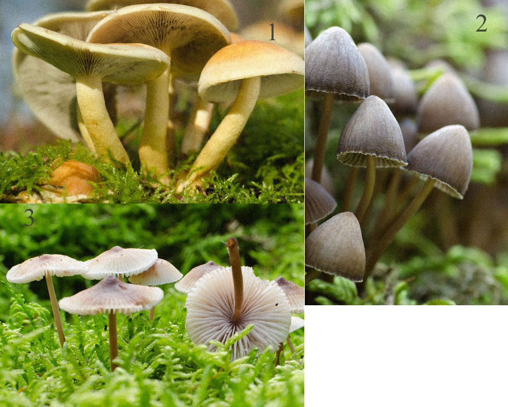 Hallo Pilzfreunde! Wer weiß Rat? Ich bräuchte die genauen Namen der hier abgebildeten Pilze. Meines Erachtens nach, handelt es sich um den Grünblättrigen Schwefelkopf, gelbstielige Helmlinge und ?Helmlinge?. 1. Die vermeintlichen Schwefelköpfe waren ca. 50-60 mm hoch. 2. Die vermutlichen gelbstieligen Helmlinge waren mehrere Gruppen von je ca. 10-20 Pilzen. Die Hüte waren ca. 10-15 mm hoch und die Stiellänge betrug ca. 4-5 cm. 3. Die Hüte der anderen ?Helmlinge? waren im Durchmesser ca. 15-20 mm. Alle Pilze befanden sich in einem Mischwald, auf Moos und an kleinen alten Baumstümpfen. Vielen Dank und beste Grüße
