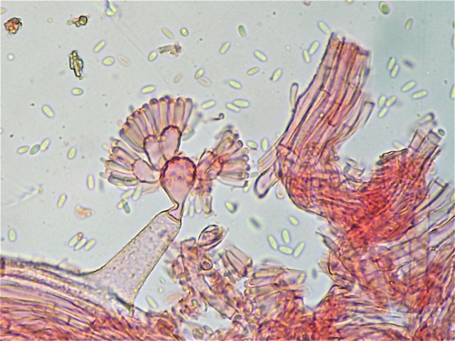 Unter dem Mikroskop (x400) sehen die kleinen Knötchen so aus. Daneben viele Konidiensporen.