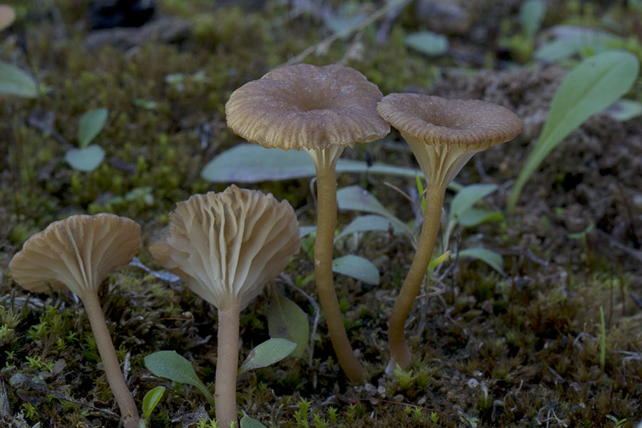 Zerstreut ein paar wenige davon, es sollte Omphalina pyxidata - Rotbrauner Nabeling (1) sein: