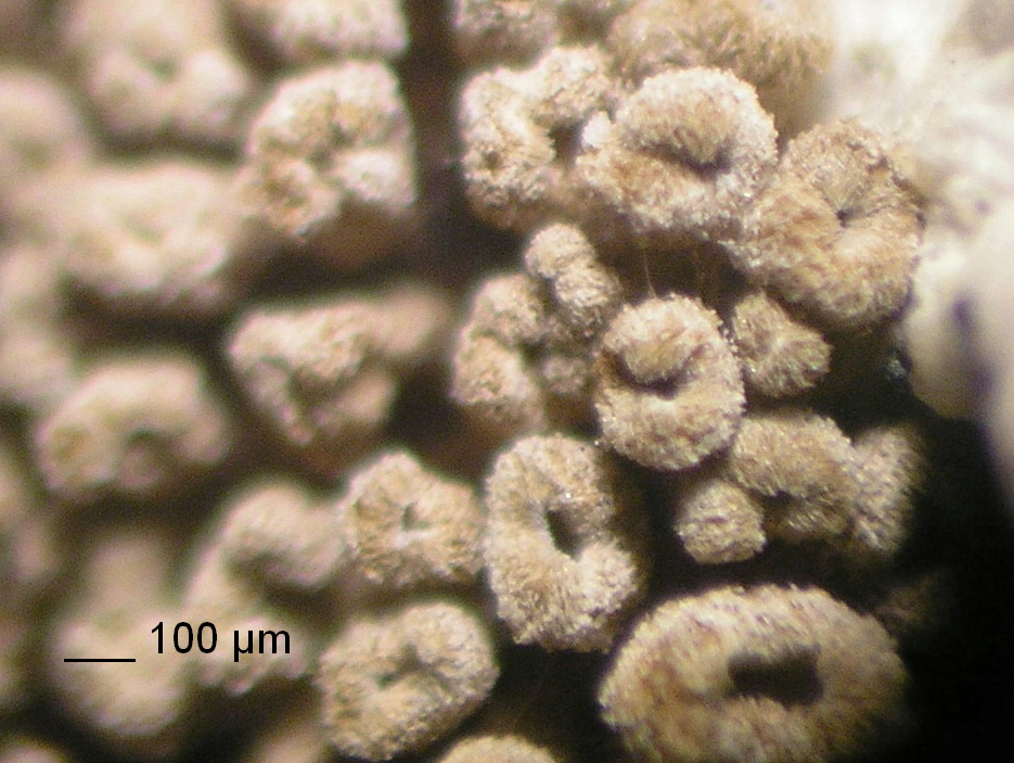 Aussenhaare hellbraun, auffällig gekrümmt und teilweise an der Spitze abgerundet und verdickt. Hymenium cremeweiss und glatt. Auffällig noch die relativ langen Sterigmen.