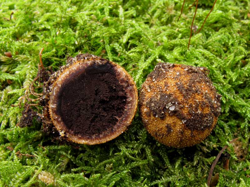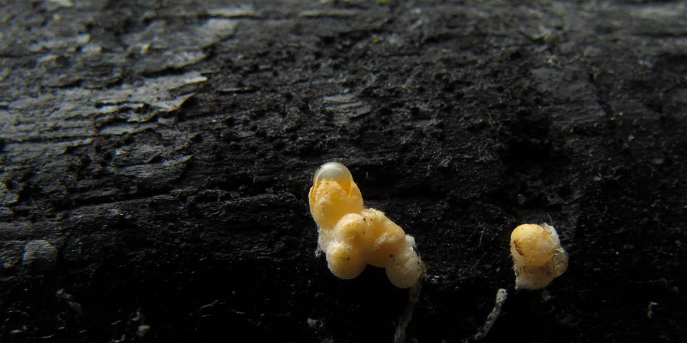 Kugelschneller Sphaerobolus stellatus auf einem angbrannten Stück Holz. Drei Wochen später hatte ich ihn dann auch zu Hause auf der Wiese neben dem Haus.