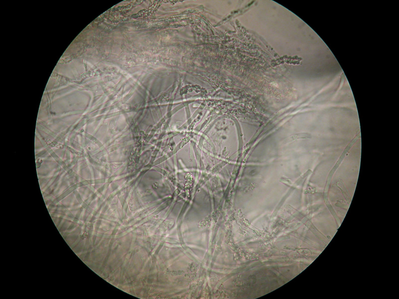 Hallo Schnuffel, hallo Ingo, das ist ja interessant, dass du, Schnuffel, deinen Fund auch zuerst als Trechispora mollusca eingestuft hast. Dies war bei mir der Grund, dass ich den Pilz überhaupt dokumentiert habe, denn die resupinaten Porlinge sprechen mich nur an, wenn ich sie auf meiner privaten Kartierfläche finde, wo ich eben alles mitnehme. Die Mycobankbeschreibungen habe ich schon bis in die Puppen rauf und runter studiert und stoße mich da immer an der Abbildung von RYVARDEN, wo die Sporen viel schmäler dargestellt sind als in meiner Aufsammlung. Sonst würde Vieles gut passen. Besonders die Fotos auf der schweizer Internetseite "Aphyllo.net" überzeugen mich, dass es tatsächlich die Skeletocutis alutacea sein kann: http://www.aphyllo.net/php/spec.php?id=1217700 Die von mir dokumentierten Sporen würden mehr zu Ceriporiopsis gilvescens passen, wie Ingo richtigerweise festgestellt hat. Ceriporiopsis ist aber monomitisch! Hier habe ich nochmal ein Foto angehängt, wo man ein unverzweigtes Hyphengeflecht sieht, wie es von LOWE in der Originalbeschreibung beschrieben wird (siehe Foto). Ich denke, dass dieser Fund sicher in Skeletocutis zu suchen ist. Möglicherweise habe ich ein sehr junges Exemplar gefunden mit untypischen Sporen (?) - oder, die Sippe ist komplex *ärger* und ungenügend bearbeitet. Vielleicht bringen uns neue Funde da weiter. @Schnuffel: Vielen Dank für deinen Hinweis, der hat meine Vermutung nun bestätigt. Gruß