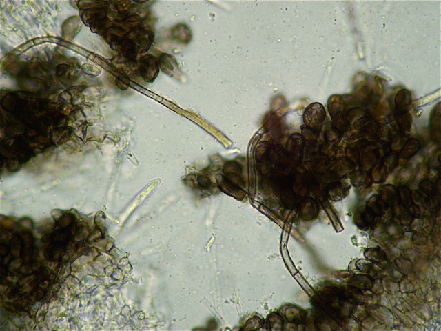 Die Mollisia spec. erinnert mich stark an Tapesia fusca, die ja auch auf einem braun-schwarzen Filzgewebe steht. Du müsstest stark septierte dunkle Hypen sehen.