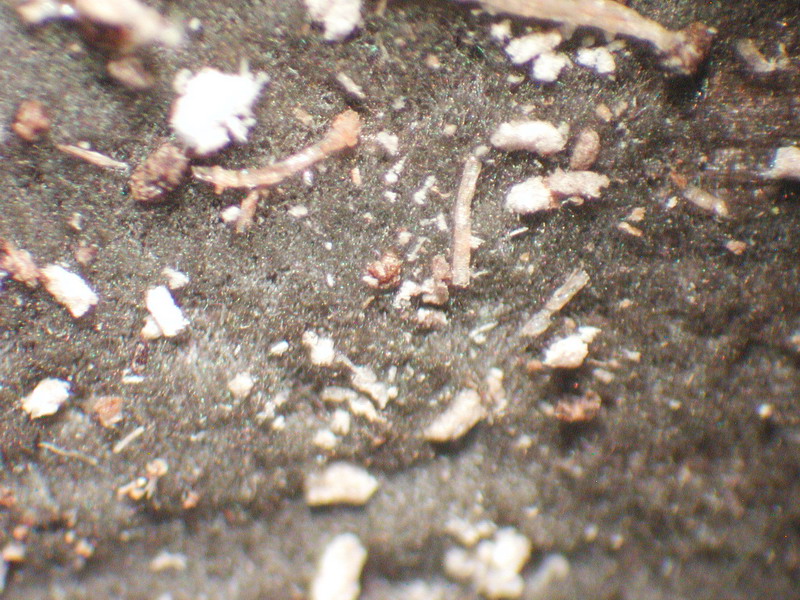 Bild unter dem Stereomikroskop, fein watteartig graugrünlich, nicht fest
