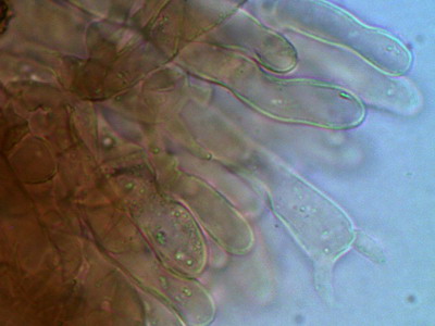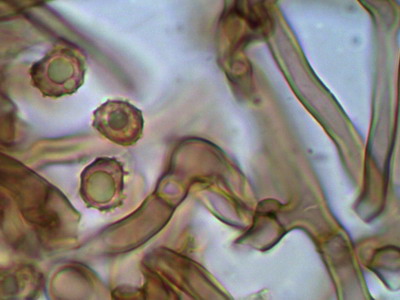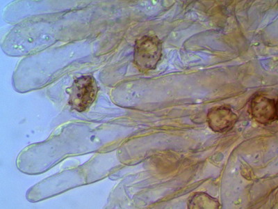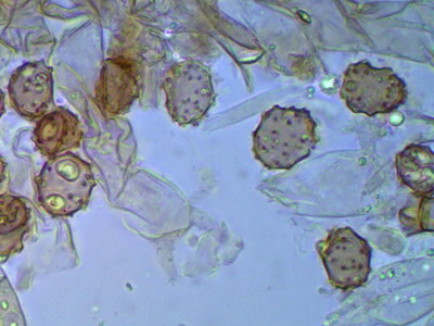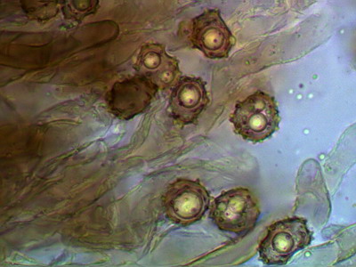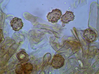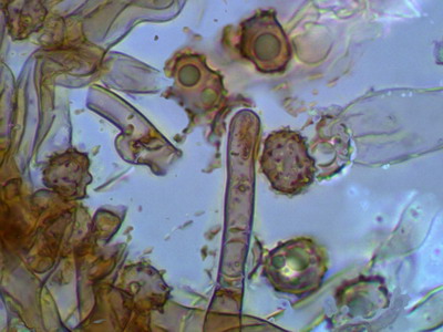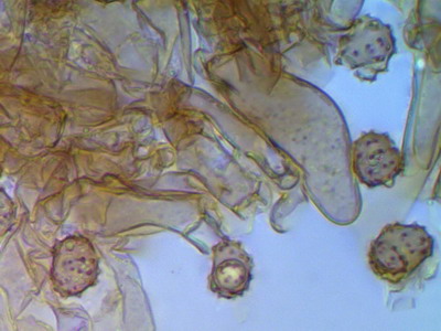 Hallo Peter und Pilzfreunde Eine Tomentella unter dem Glas zu haben ist für mich immer ein Genuß, mit der Bestimmung hapert es aber noch. Zumindest färben sich die Sporen nicht in KOH 3% um und die Hyphen besitzen an den Septen Schnallen. Die Sporen sind unregelmäßig geformt und nicht rund, deshalb scheidet Peters Tomentella schon mal aus. Die Sporengröße ist 7.0-7.9-8.7 x 5.3-6.2-8.0 ohne Stacheln gemessen. Schwierig für mich zu entscheiden ist, ob Zystiden vorhanden sind oder nicht, im Quetschpräparat sind einige zystidenähnliche Elemente zu sehen, aber ob das nur Hyphenenden oder unreife Basidien sind, wage ich nicht zu entscheiden.