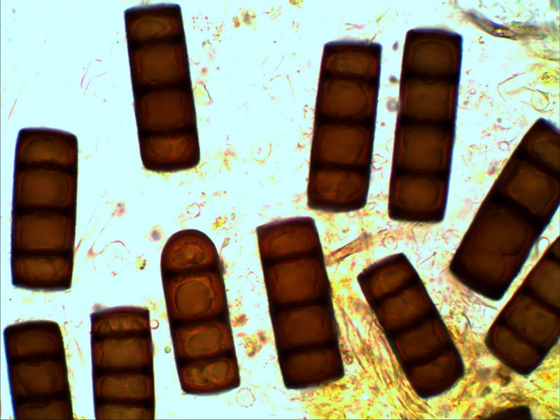Nun Nr.01, ein knallgelber Rindenpilz (an Esche) unter den Glas gelegt. Was sind das denn für Bausteine? Sporen? Nein, die vom Rindenpilz habe ich schon gefunden, sehr kleine Sporen mit langen Stacheln. Was sind die braunen Zäpchen, neugierig fragend? Größe 37µm x 13µm im Mittel