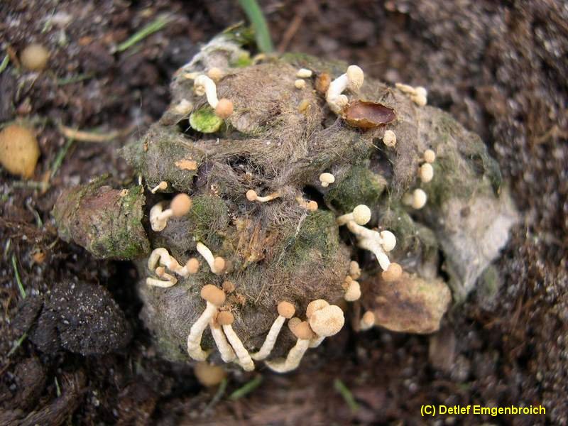 da Du schreibst, dass der unbekannte Konidienpilz auf einem Gewölle sitzt, tippe ich mal auf eine Frühform von Onygena corvina siehe hier: