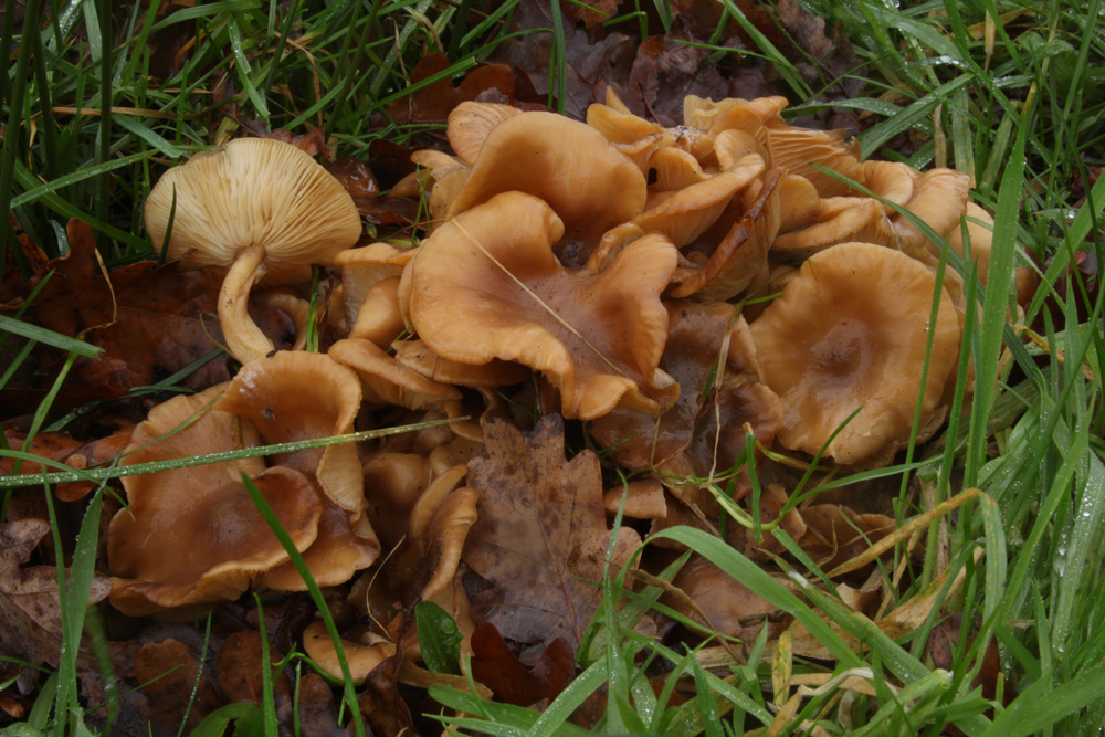Heute war ich wieder draußen - trotz Nieselregen. An dem Zwarte Water - ein verlandender Maasarm nördlich von Venlo - habe ich diese büschelige Anordnung von Geselligen Raslingen gefunden. Da ich den aber einigermaßen kenne, bin ich mir nicht so ganz sicher. Könnte das - obwohl es ein Wunder wäre - auch der Ringlose Hallimasch sein? Vegetation: Eiche und Birke auf Quarzsand. Begleitpilze: Russula fragilis, Scleroderma citrina. Ich habe zwei Fruchtkörper mitgenommen, einen lasse ich absporen.