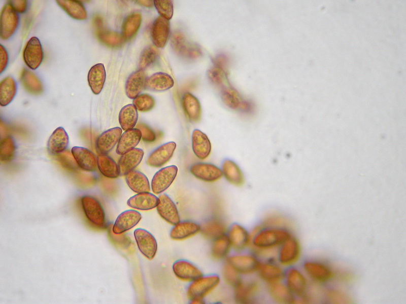 Sicher bin ich mir nicht, denn nach JEC2010 müsste auch die Huthaut mit KOH orangegelb werden - wird sie aber nicht, sondern nur dunkler braun. Die auffälligenn violettbraunen Flecken am Stiel und die kleinen Sporen würden schon passen. Bislang hatte ich nicht auf diese Art geachtet, weil die Variecolores beim Bestimmen mitunter Frust verurachen und deshalb nicht selten im Wald bleiben;-) Hier im Forum ist sie, glaube ich, auch noch kaum aufgetaucht. Sporen amygdaloid, Apex schmal gerundet, unterm Apex oft ein- oder beidseitig eingeschnürt, mäßig bis normal warzig; Maße: 9,6 x 5,3 (8,5-10,5[11,5] x 5-5,5), Q=1,82 (1,55-2,09);
